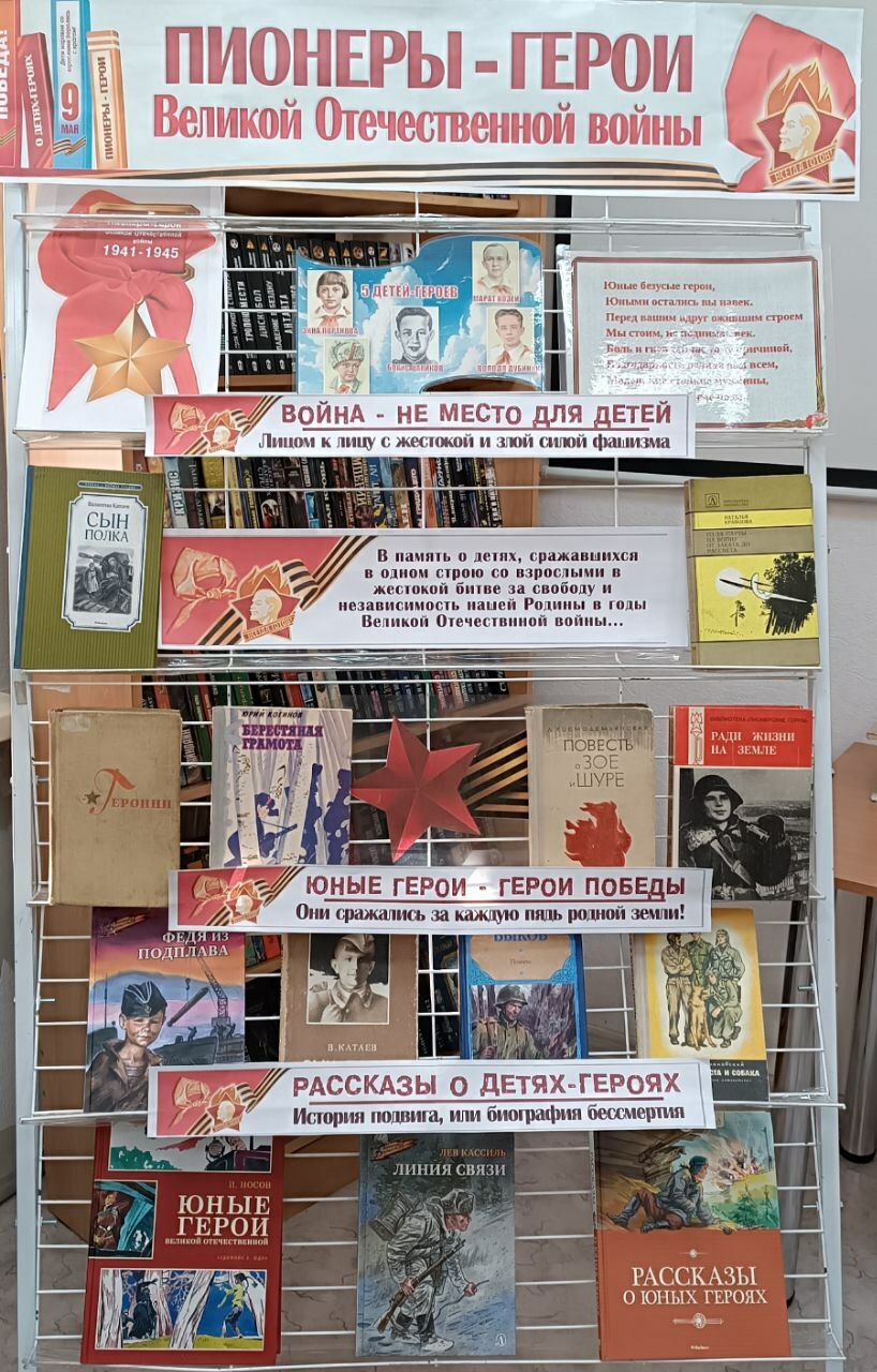 На выставке представлены художественные и документальные издания о юных героях, которые боролись и умирали за свободу, равенство и счастье людей: «Повесть о Зое и Шуре» А. Космодемьянской, «Линия связи», «Федя из Поплава» Л. Кассиля, «Юные герои» И. Носова, «Сын полка» В. Катаева, сборники рассказов о юных героях